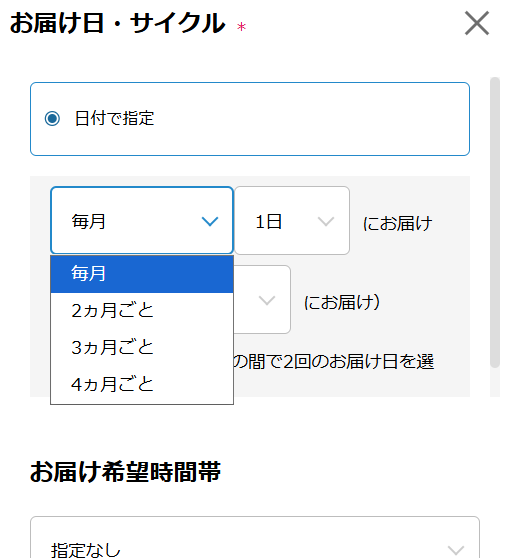 8. 「お届け日時を選ぶ」→「日付で指定」をご選択後、ご希望のお届けサイクルと1日または15日をご選択ください。