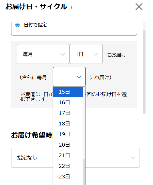 ※2週間に一度の配送をご希望の方は、以下画像の通り、毎月1日・さらに毎月15日をご指定お願いいたします。