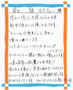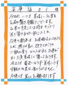 今年度は、米不足が騒がれ担い手さんも減っている中で、真摯にお米作りに取り組まれこうして届けて下さることに感謝しかありません。