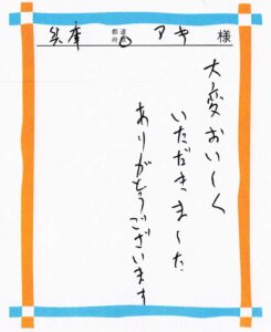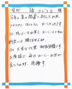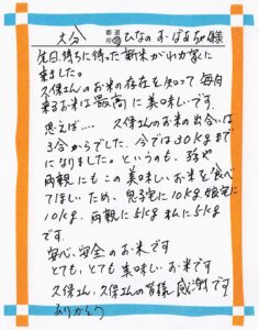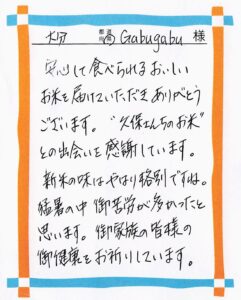 今日わ、いつも美味しいお米をお届け頂き有り難うございます。
