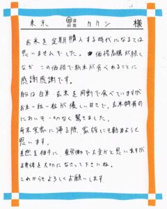 今年度は、米不足が騒がれ担い手さんも減っている中で、真摯にお米作りに取り組まれこうして届けて下さることに感謝しかありません。